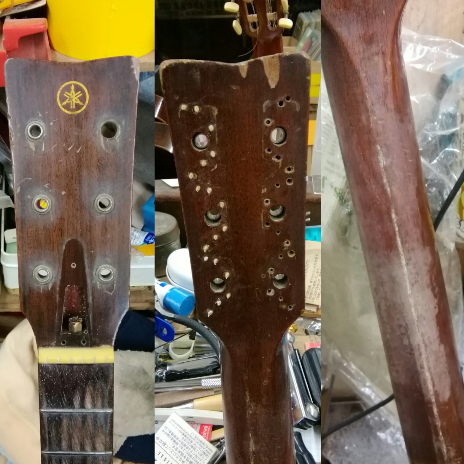 とりあえず全体の汚れを落として、クラックや剥がれを補修、酷かったヘッド裏は一度全部穴を埋めてからバタービーンタイプのペグを着けて、欠品していたサドルは新しいものを調整して着けて、昔のヤマハ特有(?)の弦が全体に中に寄っていて、6、1弦がフィンガーボード端から遠いナットはおまけに弦溝が等間隔でなかったのもあって、やはり新しいものにして、、なんとか弾けるようになりました。