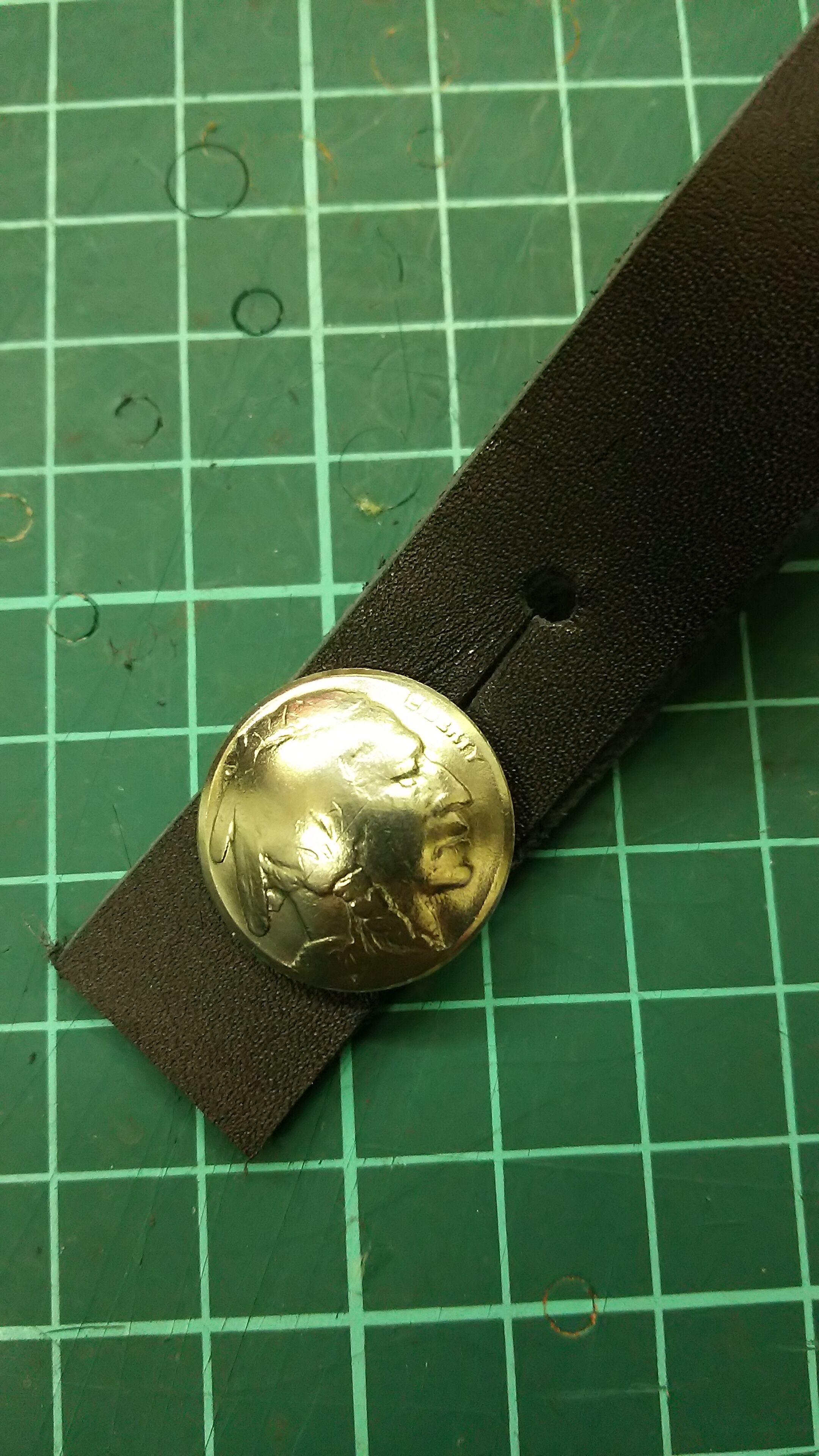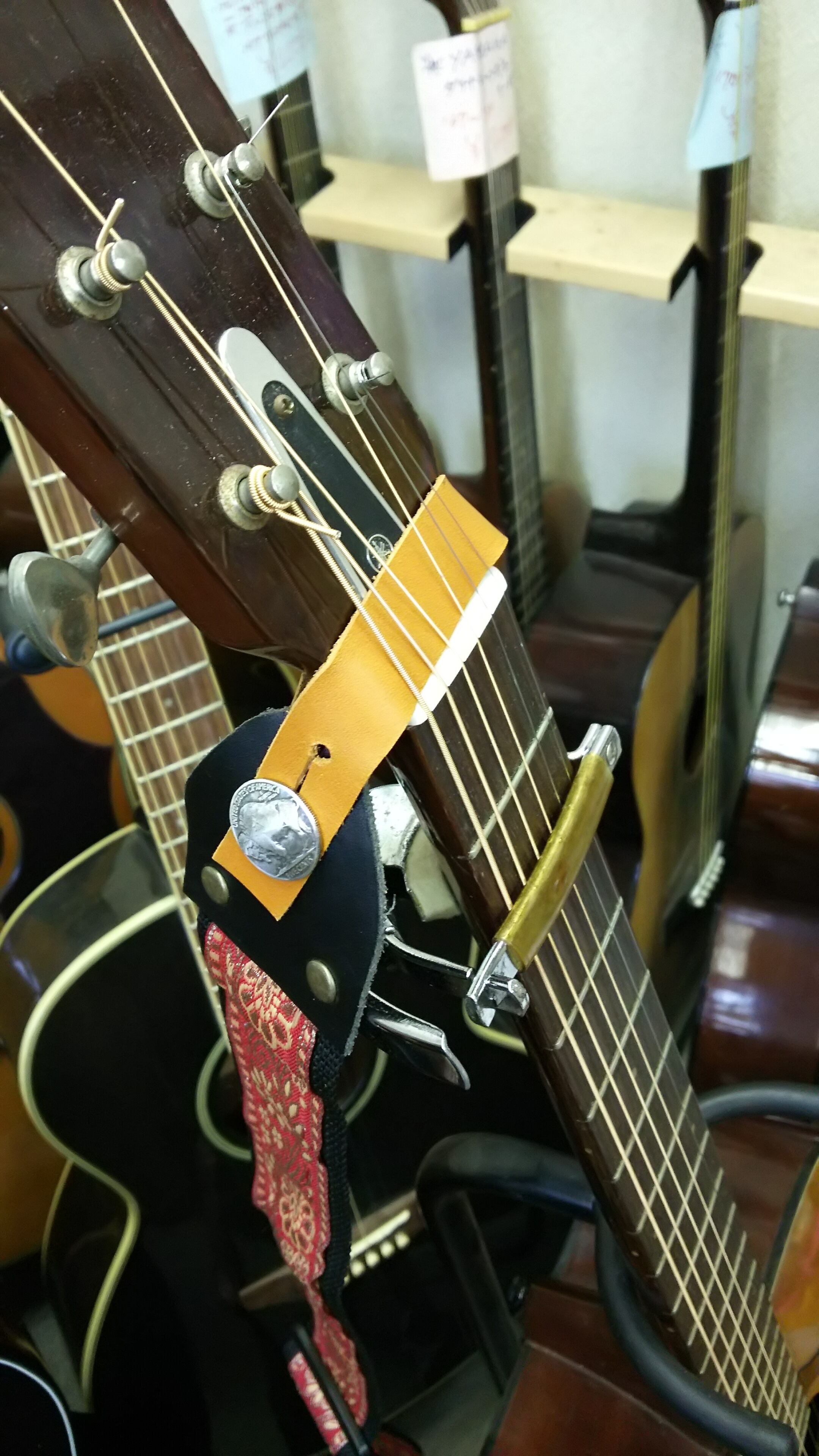 ピンになる部分は飾りを兼ねてコンチョを使いました。(後ろの写真は装着見本です)長さは余裕をもって作ったので、ネックの太いギターや幅の広いクラシックギターにもじゅうぶん使えると思います。(クリアランスの関係で、あまり分厚いストラップには厳しいかも知れません。また使用するストラップによっては若干穴を広げる必要があるかも知れません)もちろんウクレレにもバッチリです。(幅約18mm、厚さ約1.4mm、長さ約220mm、コンチョ径約21mm)