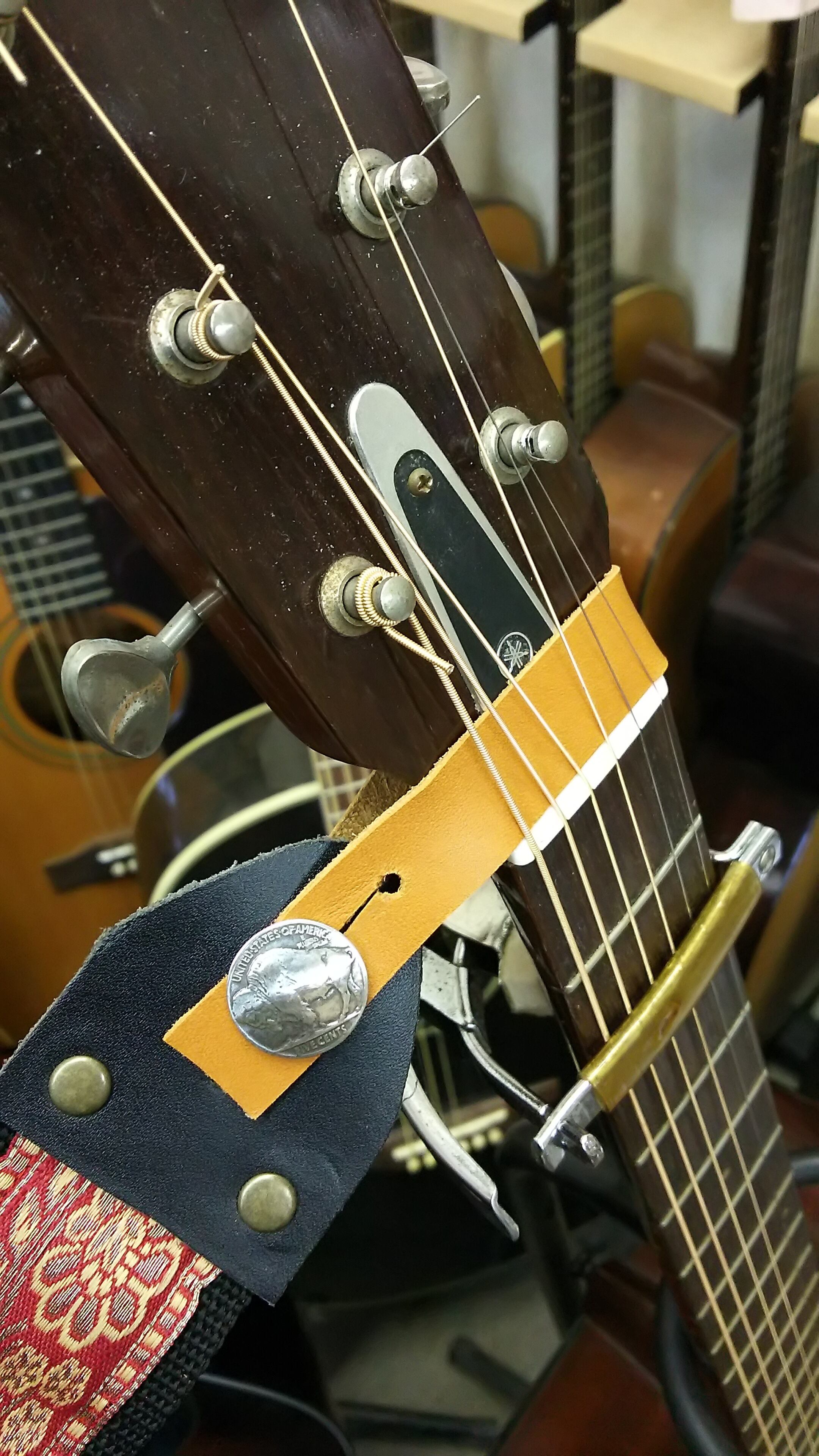 ピンになる部分は飾りを兼ねてコンチョを使いました。(後ろの写真は装着見本です)長さは余裕をもって作ったので、ネックの太いギターや幅の広いクラシックギターにもじゅうぶん使えると思います。(クリアランスの関係で、あまり分厚いストラップには厳しいかも知れません。また使用するストラップによっては若干穴を広げる必要があるかも知れません)もちろんウクレレにもバッチリです。(幅約18mm、厚さ約1.3mm、長さ約220mm、コンチョ径約21mm)