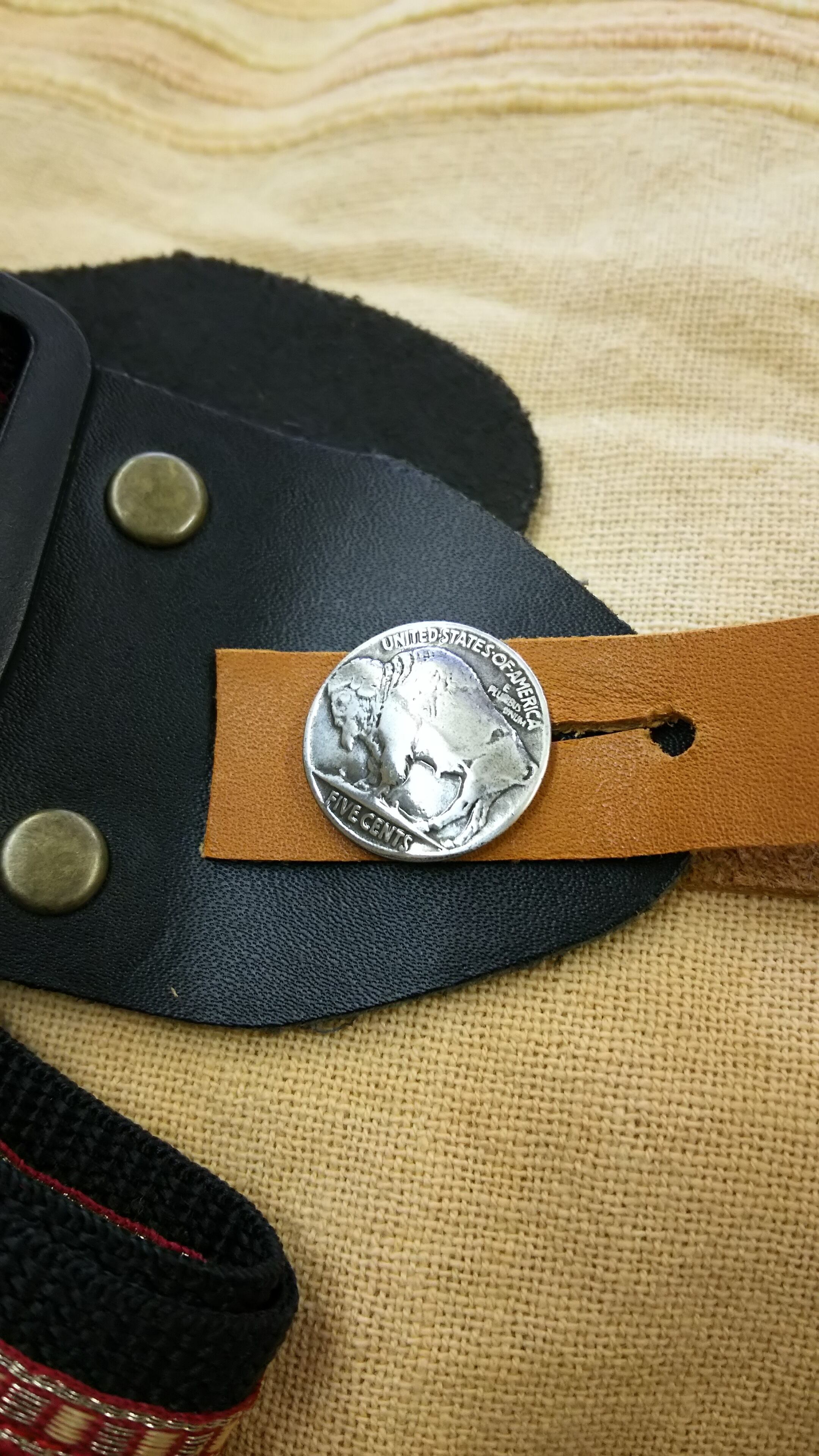 ピンになる部分は飾りを兼ねてコンチョを使いました。(後ろの写真は装着見本です)長さは余裕をもって作ったので、ネックの太いギターや幅の広いクラシックギターにもじゅうぶん使えると思います。(クリアランスの関係で、あまり分厚いストラップには厳しいかも知れません。また使用するストラップによっては若干穴を広げる必要があるかも知れません)もちろんウクレレにもバッチリです。(幅約18mm、厚さ約1.3mm、長さ約220mm、コンチョ径約21mm)