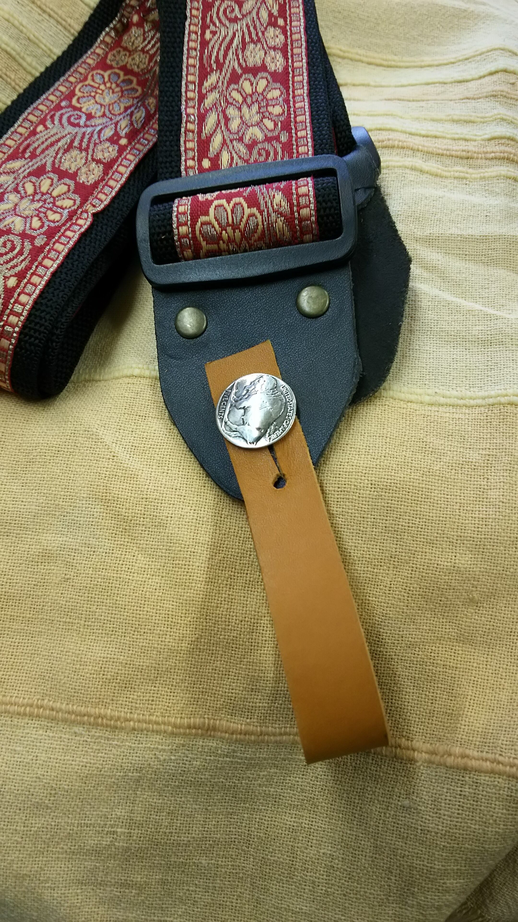 ピンになる部分は飾りを兼ねてコンチョを使いました。(後ろの写真は装着見本です)長さは余裕をもって作ったので、ネックの太いギターや幅の広いクラシックギターにもじゅうぶん使えると思います。(クリアランスの関係で、あまり分厚いストラップには厳しいかも知れません。また使用するストラップによっては若干穴を広げる必要があるかも知れません)もちろんウクレレにもバッチリです。(幅約18mm、厚さ約1mm、長さ約220mm、コンチョ径約21mm)