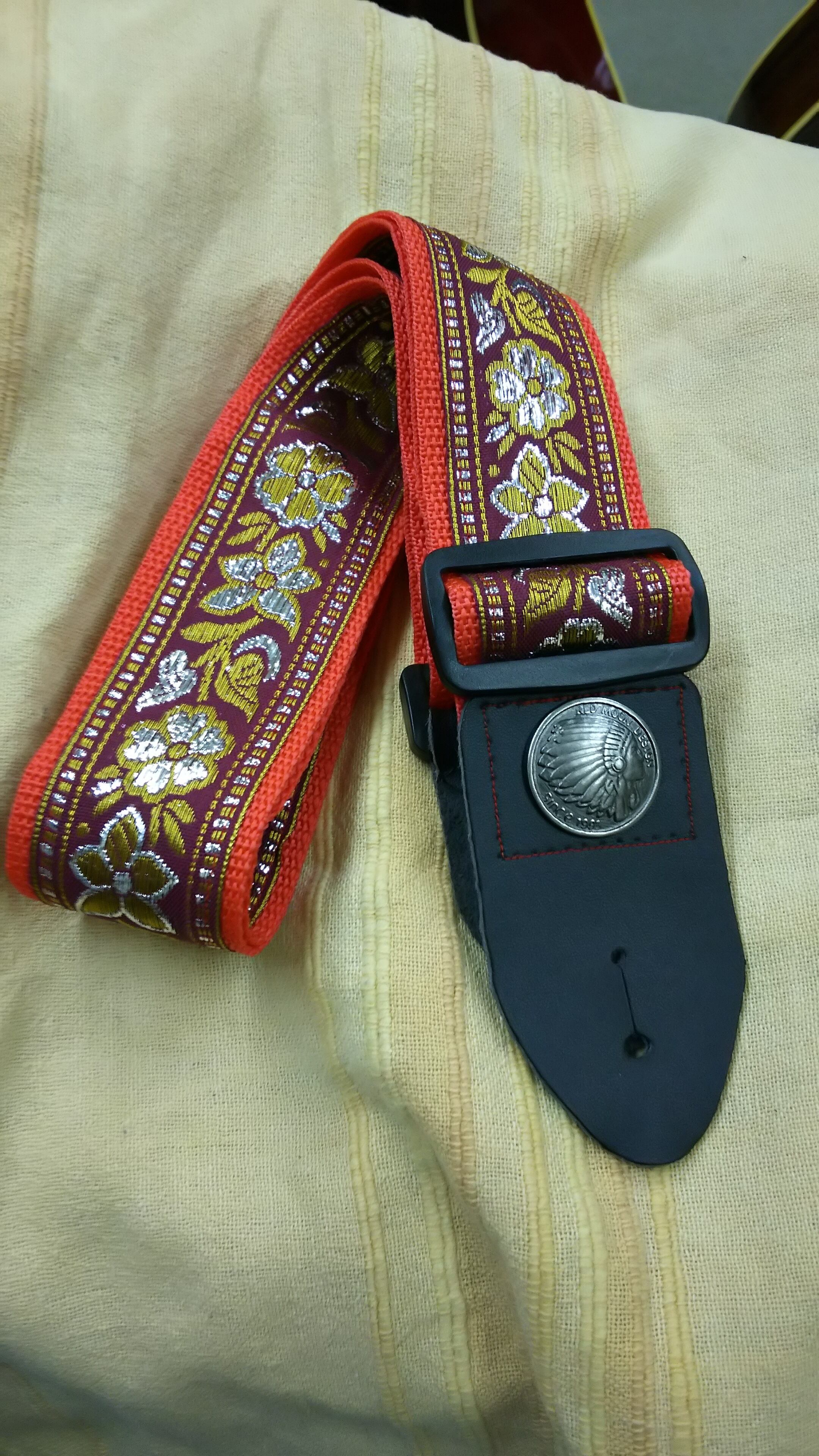 プレーンでシンプルなストラップをエスニックな花模様のテープでリメイク、リベットの代わりに補強を兼ねてコンチョを飾りました。ベースになっているストラップは使えそうなものが入ったときに少しずつ取っておいたもので、みなそれぞれ違うものなので、ひとつとして同じものはありません。もちろん機能的な部分が大切なストラップですが、ちょっと人と違った色や柄で少しだけオシャレしてみるのはどうでしょう?もちろんギターだけでなくストラップピンが着いていればウクレレにも。あるいは工夫次第で他のものにも使えそうです。(幅約50mm、最大長約1320mm)