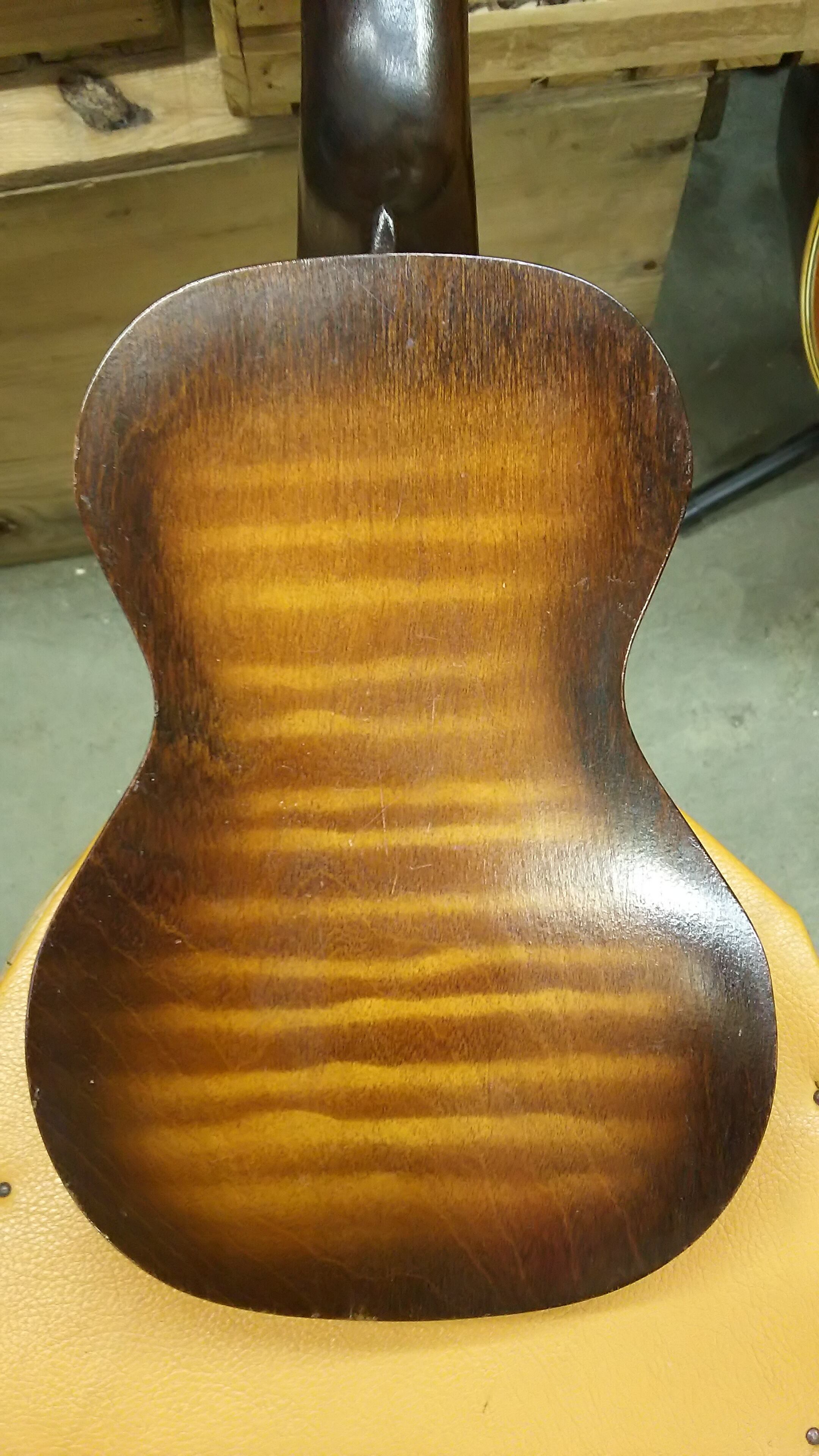 ボディトップがひどく歪んで、一部剥がれ、ブリッジ、バックも剥がれかけていたので、一度剥がして、修正、補強も兼ねてブリッジプレートとブレーシングを一ヶ所追加して再接着しました。