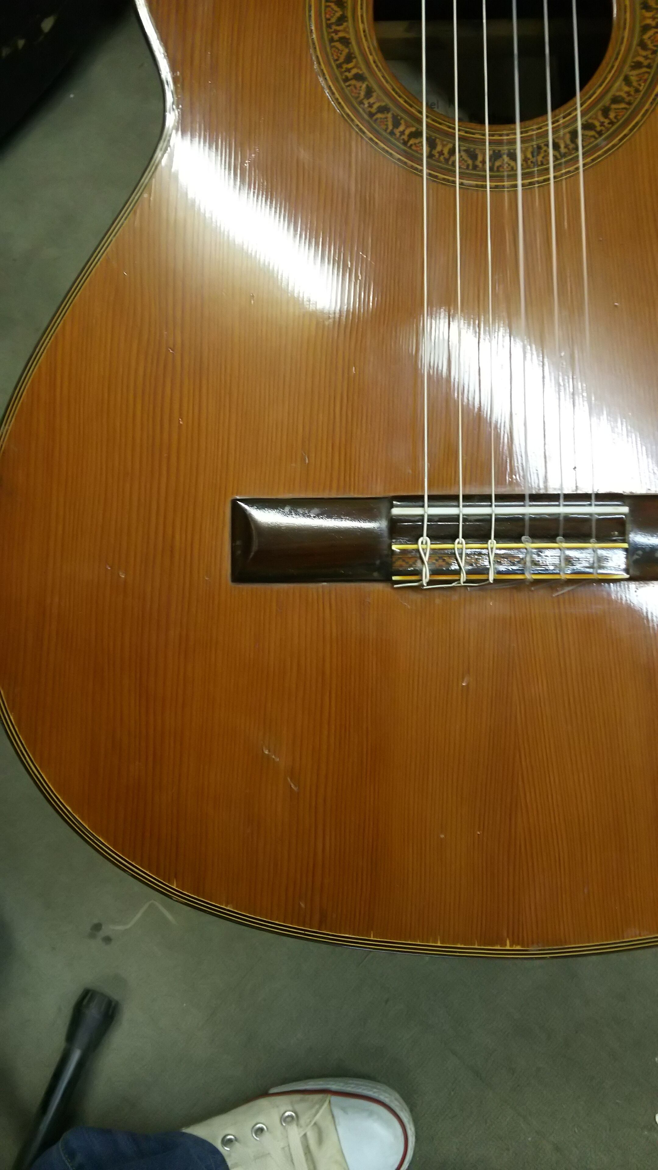 信濃楽器。60年代終わり~70年代はじめくらい?トップ/スプルース?サイド、バック/ローズウッド?ネック/不明、フィンガーボード/ローズウッド?あまり弾き込んだ感じではありませんが、どこかの押し入れなどに長くしまわれていたのでしょうか?非常に汚れていて、傷もひどく多く見えましたが、磨いてきれいにしてみると傷もあまり目立たなく(それでも多いですが)なりました。トップサウンドホール下のブレーシングに割れがありましたが接着、ペグはオリジナルですが動きはスムーズです。ネックにやや元起きがありますが、弦高は12F4mm程度で、それほど高くありません。薄めなネックは押さえやすく、ナットの調整をして弾きやすくなっていると思います。当時のShinanoGuitarのラインナップの中ではわりあい上位のモデルなようで、材も悪くないように見えます。弦長約662mmと当時の標準的なものより長いスケールで音にハリがあり、音量も豊かです。