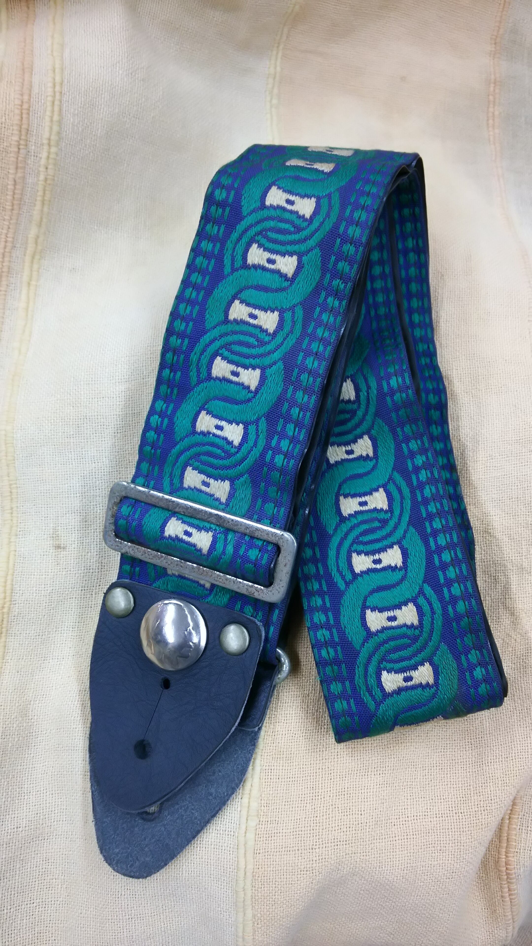 '70s~'80sあたりには主流だったジャガード織のストラップです。ACEなど本家のものではなく主に国産の復刻版ですが、中古ギターなどを買い入れたときに一緒に引き取ったりしたものの中から少しずつストックしたものです。革部分がダメになっていたので、他の使われていなかった革ストラップの一部を使って新たに作り、リベットも打ち直して、補強も兼ねてコンチョで飾りました。裏はスウェードのタイプです。古いものですが、まだまだじゅうぶんに使用できるものと思います。古きよき時代のストラップはいかがでしょう?(幅約50mm、最大長約1440mm)