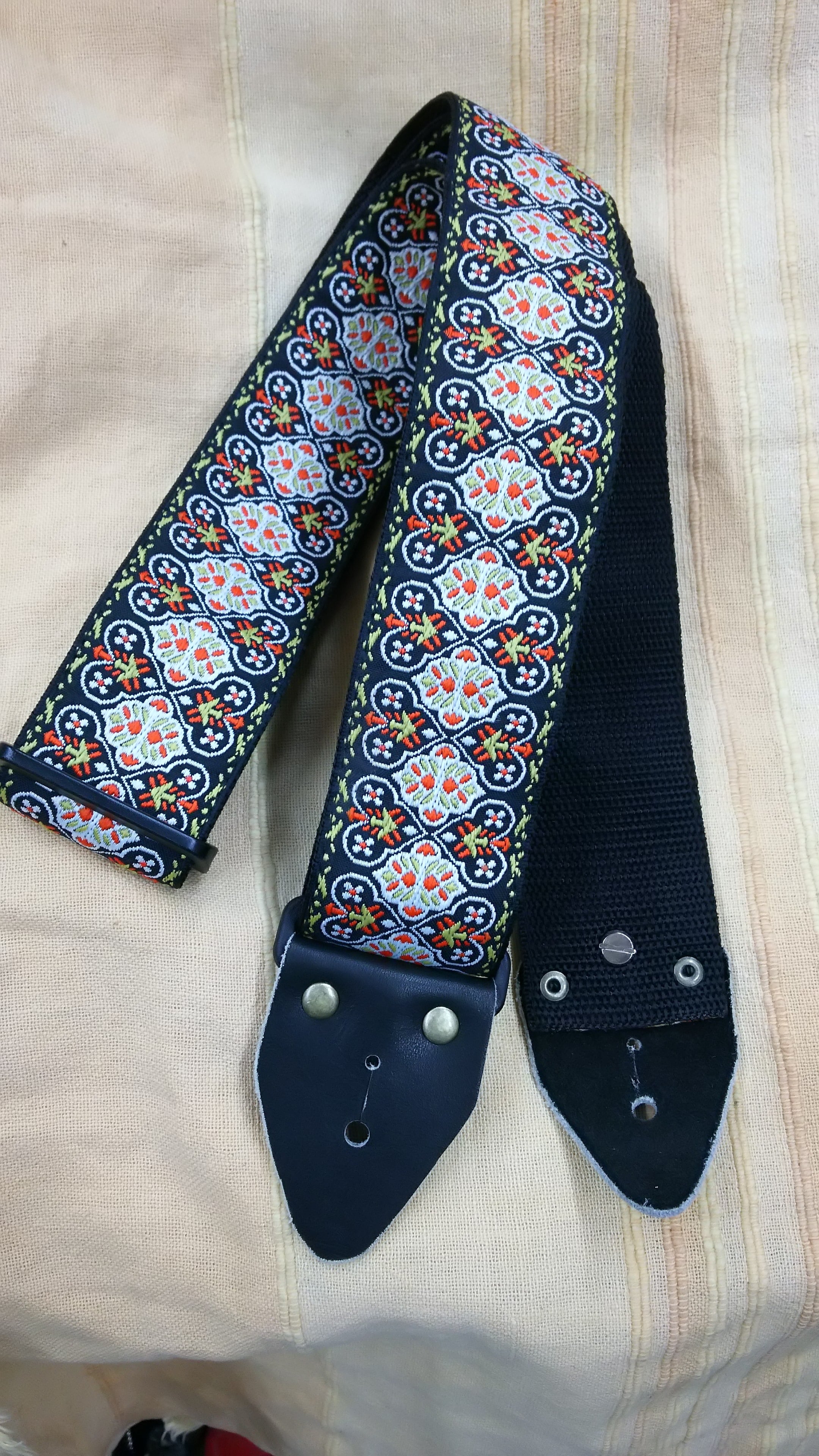 '70s~'80sあたりには主流だったジャガード織のストラップです。ACEなど本家のものではなく主に国産の復刻版ですが、中古ギターなどを買い入れたときに一緒に引き取ったりしたものの中から少しずつストックしたものです。革部分は革ハギレから新たに作り、リベットとともに補強も兼ねてコンチョで飾りました。裏はナイロンのタイプです。古いものですが、まだまだじゅうぶんに使用できるものと思います。古きよき時代のストラップはいかがでしょう?(幅約50mm、最大長約1460mm)