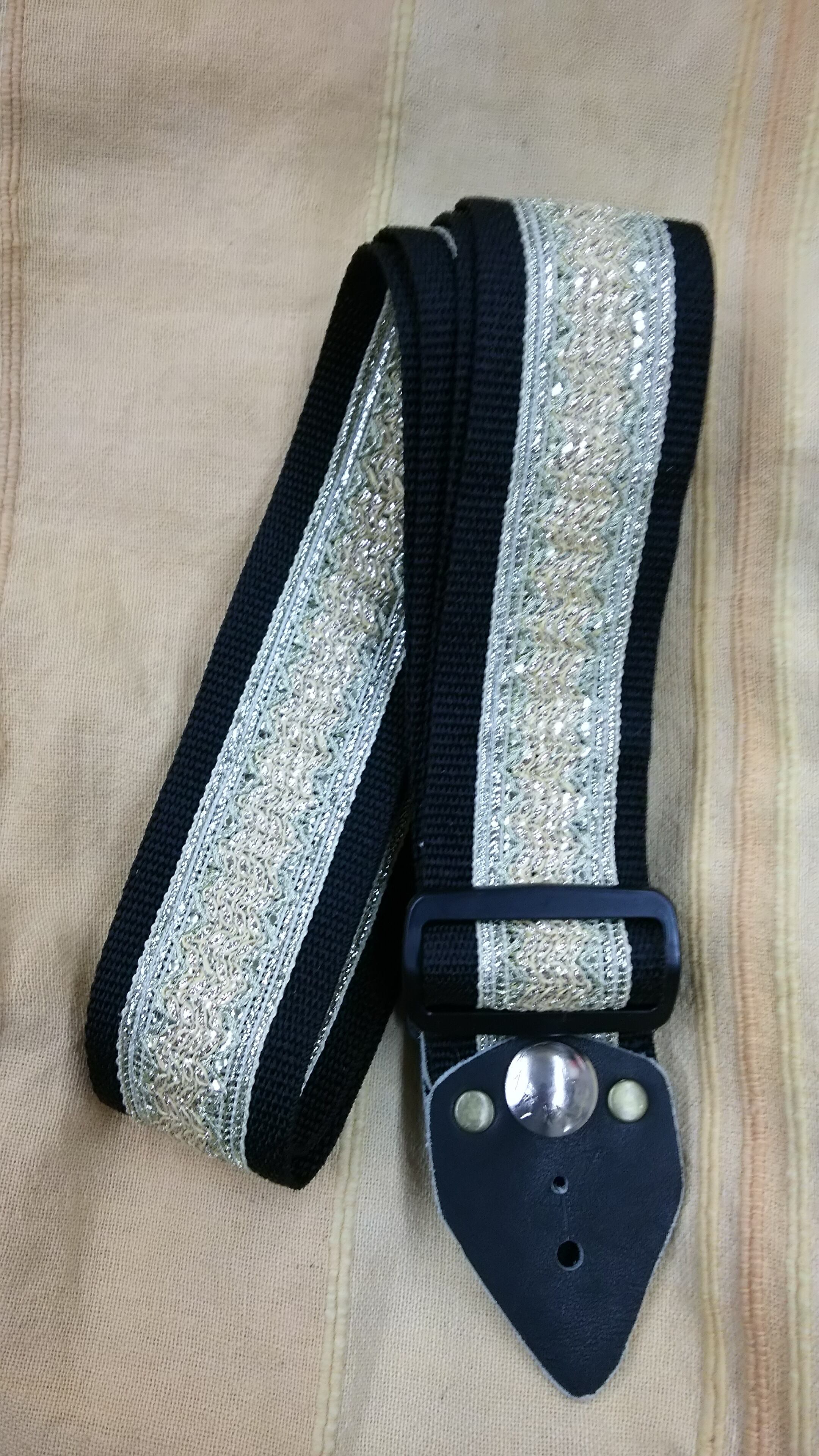 使われなかったプレーンなストラップをインドのキラキラ光るミラーリボンでリメイクしました。インドではキラキラ光るミラーやスパンコールは魔除けになると信じられているそうです。革部分も革ハギレから作り、リベットとともに補強を兼ねてコンチョで飾りました。ベースになっているストラップもいろいろですし、その都度ひとつひとつ手作業で作っているので、ひとつとして同じものはありません。もちろん機能的な部分が大切なストラップですが、ちょっと人と違った色や柄で少しだけオシャレしてみるのはどうでしょう?もちろんギターだけでなくストラップピンが着いていればウクレレにも。あるいは工夫次第で他のものにも使えそうです。(幅約50mm、最大長約1720mm)
