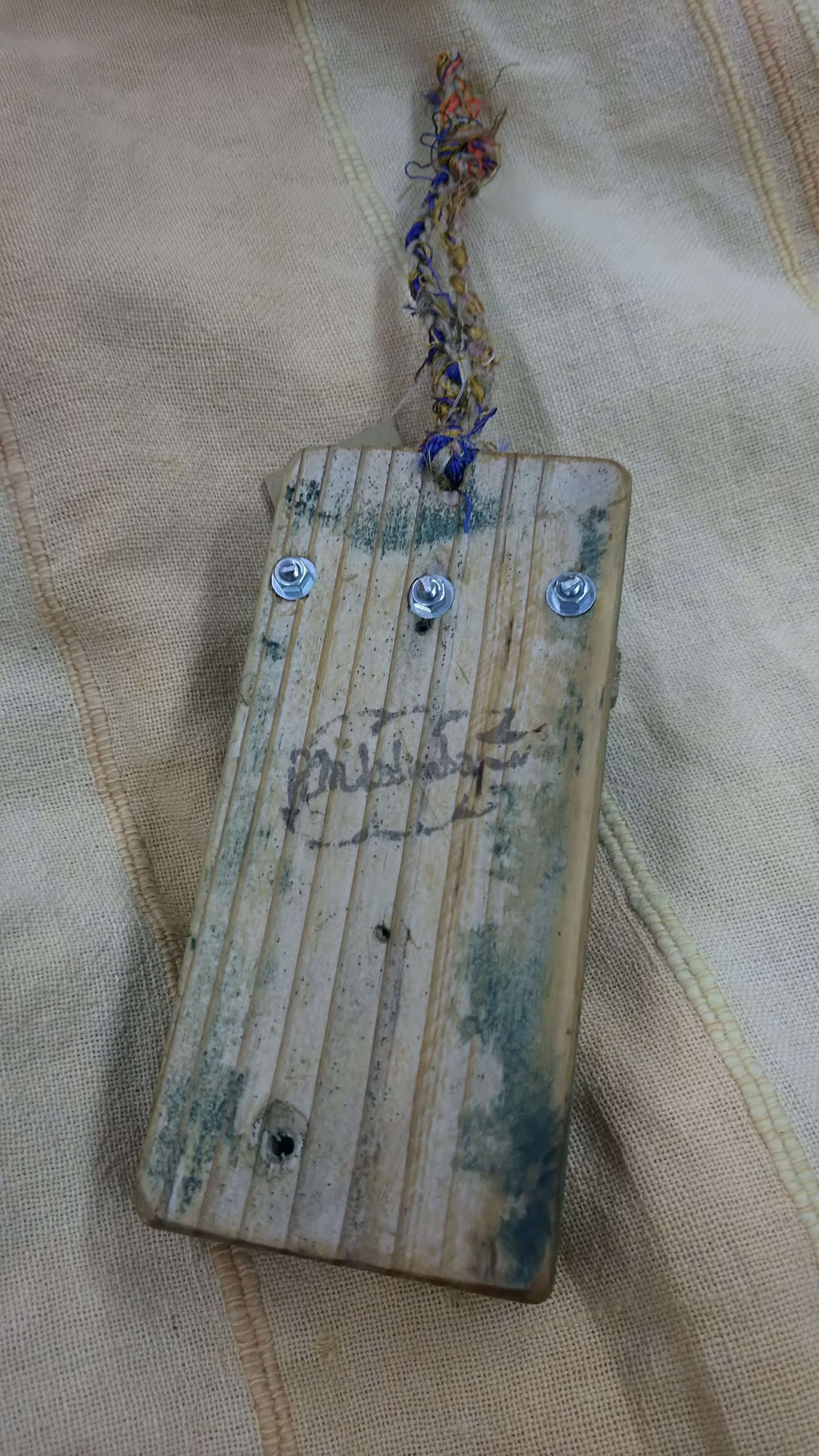 どこかのたぶん家具かなにかの廃材で作った6キーカリンバです。軽めな材ですが、まろやかに響き、中央の木なボタンのバズがジージーと鳴ります。6本のキーはGmaj7ヘキサトニックスケール(G,A,B,D,E,F#)にチューニングしていますが、キーは動かせますので、ご自分でお好みにチューニングされることも可能です。一日の終わりに静かに爪弾いてリラックスするのもいいし、もちろん他の楽器と合わせたり、歌を歌ったり、ひとつの楽器として立派に使えますよ。