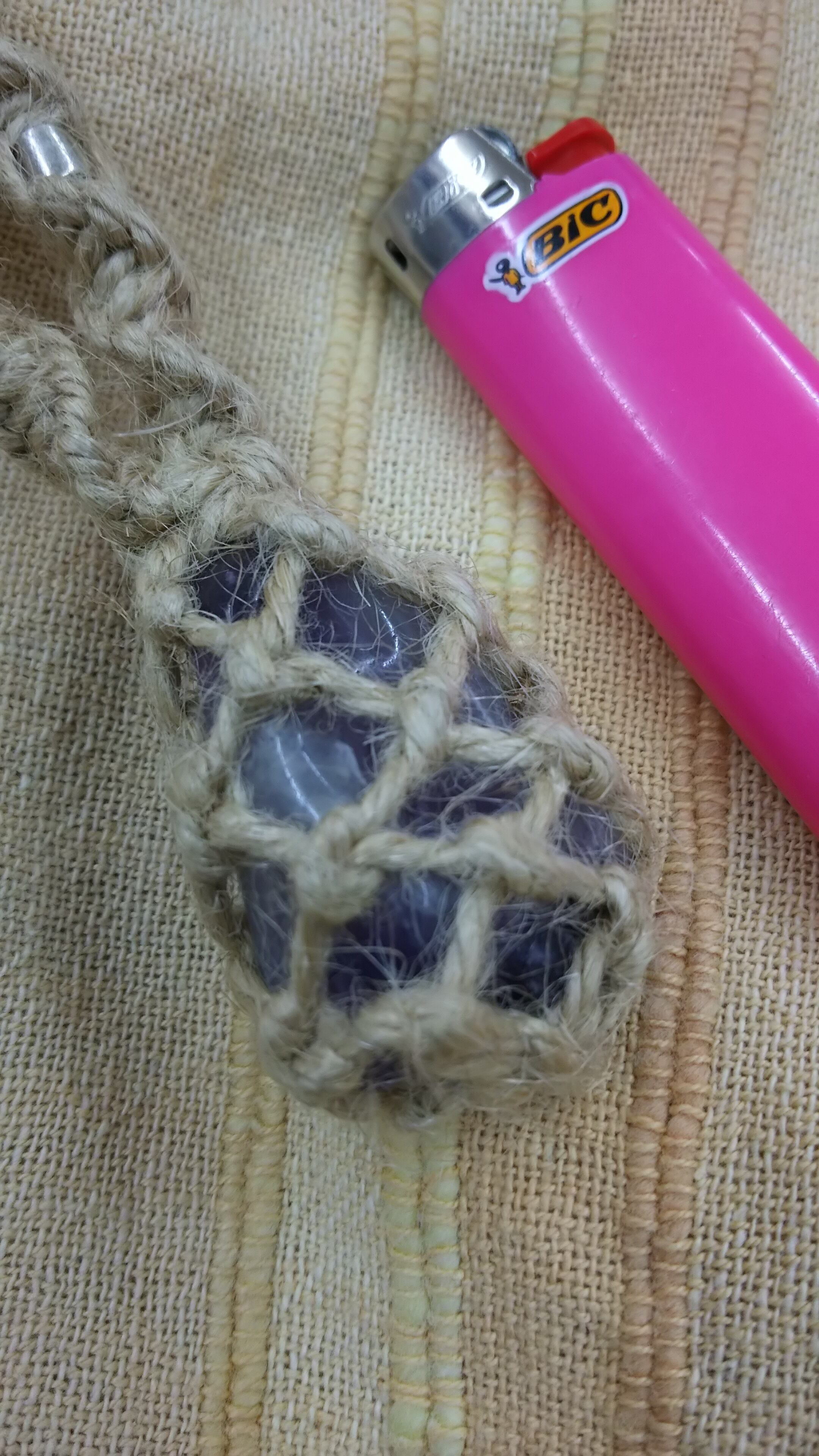 ゴロンとした原石のままのようなアメジストをジュートで編みました。片側にポツンと着いているのは知人の銀粘土作家に作ってもらったビーズです。頭からスッポリ被れるくらいの長さです。後ろの結び目で調節などして下さい。(トップ長約43mm)