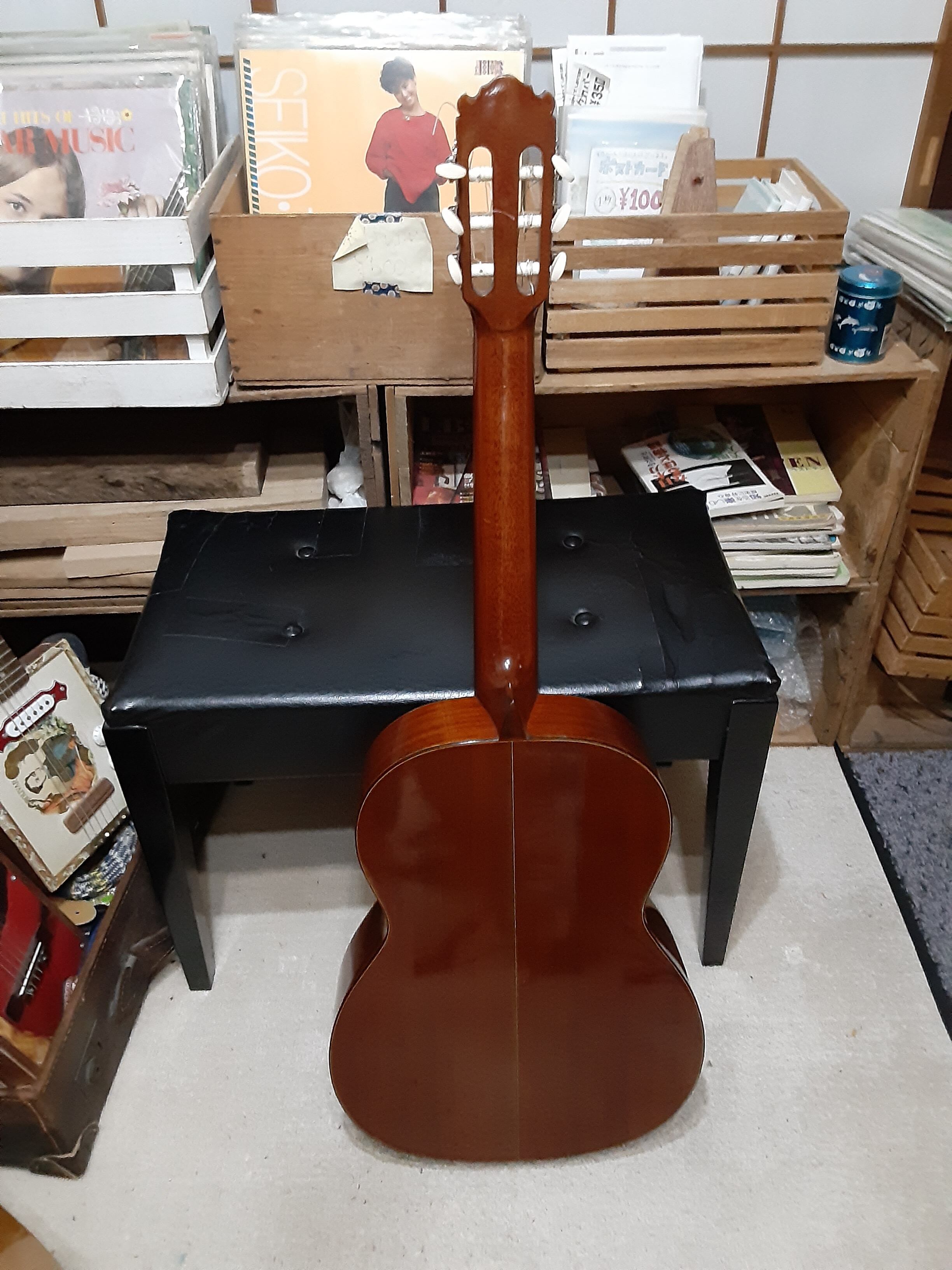 年式、素性不明。ラベルその他手がかりがありませんが、内部にシリアルがスタンプされているので、それほど廉価なもなではないのかも知れません。材も不明ですが、サイド、バックはロース系の何か?トップは単板(たぶん合板ですが)に見えなくもありません。若干の元起きがあったネックを矯正、ペグ欠損していたため汎用のものを着け、ナットは低すぎるものが着いていたので、手元のストックから割合新しいものを加工、サドルは間に合わせ(?)アコースティックのようなアールのあるものが着いていたので、加工して着けました。サドルをだいぶ下げて、弦の接点に問題があったので、ブリッジのスロット上部を少し削っています。リサイクル業者の倉庫にあったもので、かなり保管が悪く、主にトップに深い傷、クラックがありますが、補修して、ブレーシングにも一部割れがあり、かなり変形して復元が難しかったのですが、固着していたので、ひどくならない程度に接着剤を入れて補修しました。全体に傷が多く見た目は悪いですが、弦高など全体にはよい状態になり、弾きやすく、低音がドオーン!と響いて、ヘタな廉価モデルよりずっといい感じで鳴りますよ。