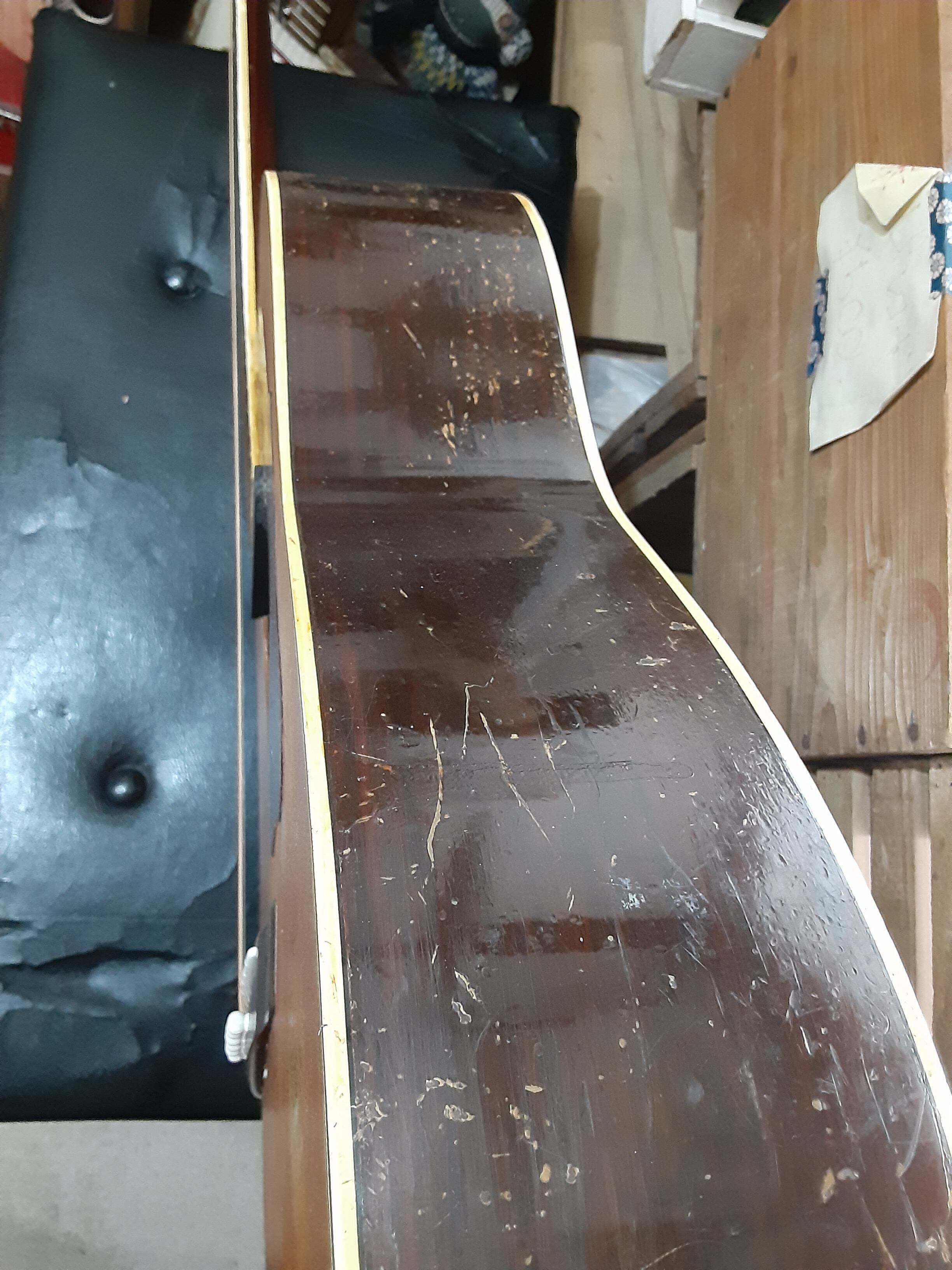 このギターはサウンドホール上部、フィンガーボードエンド部分にシングルコイルP.U.を持った、ヤマハ初(国産としても初くらい?)のエレクトリックアコースティックギターのハシリでもあるモデルですが、手元に来たときはまるでどこかで被災したかのごとくボロボロでした。ペグなどのパーツは欠品、あるいは欠損、特徴的なピックガードは熱(?)で歪み、触るとポロポロと欠けてしまうような状態、ボディトップ、バックもところところ剥がれがあり、その他ヘッドの大きな欠けをはじめ、とにかく傷だらけ。とくにトップは塗装もかなり傷んでいて、汚れもとにかくひどく、これはとんでもないものが来たな、、と驚いたものです。しかしとりあえずガンガン水拭きして、汚れを落としてみると、傷などを除けば重要な部分にはあまり大きな問題はなく、直せばなんとか弾けるようになるかな?と思いはじめて、気長に作業してみることにしたのです。
