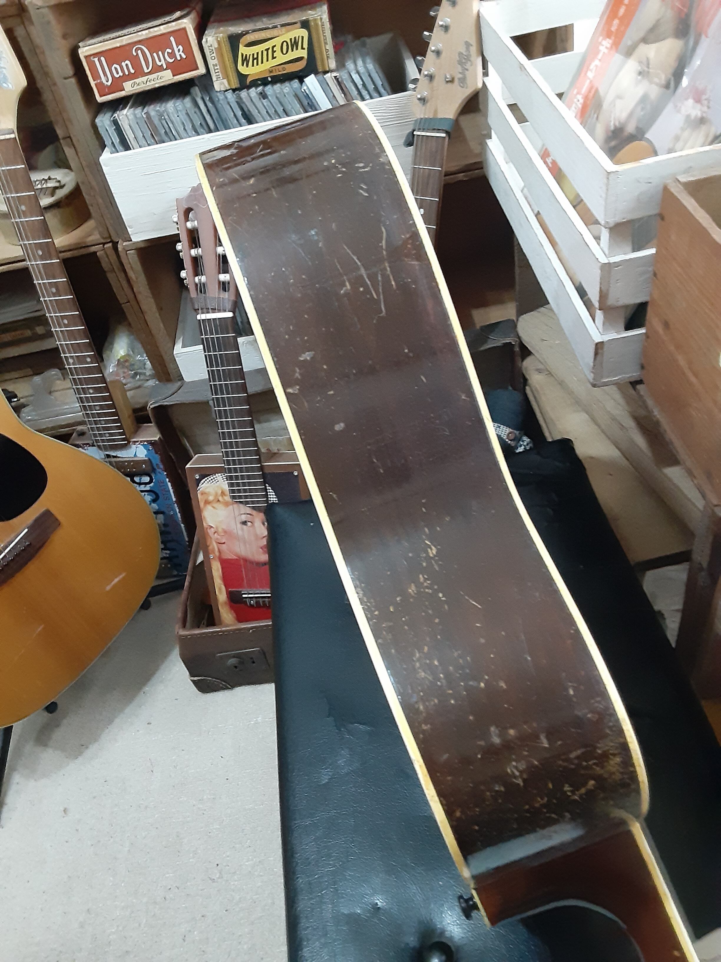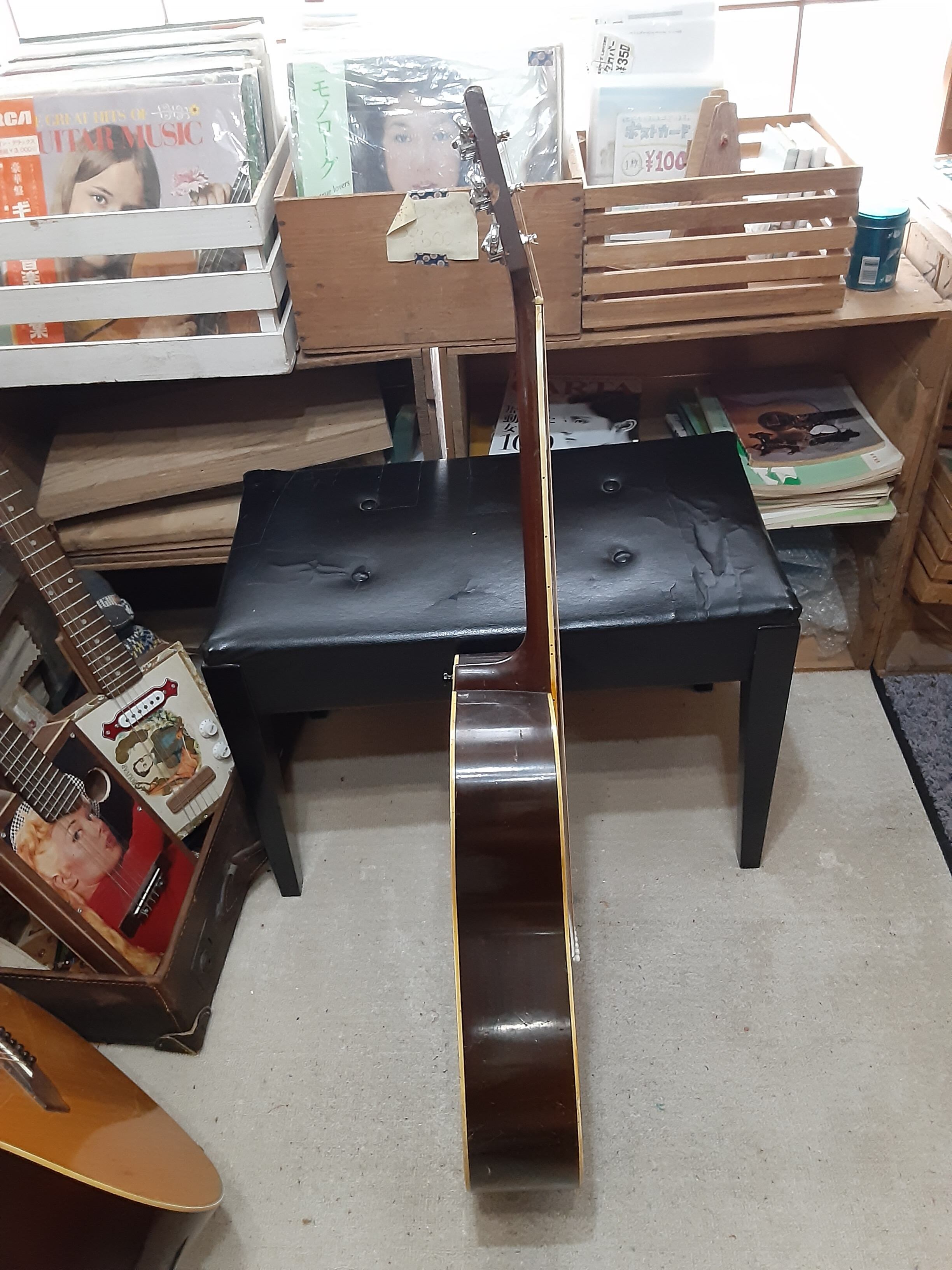 まず全体の剥がれなどを補修して、欠品していたペグは手元にあったグローバー102を着け、ナットはやはり手元のストックの中から古いヤマハのものを加工、サドル、ブリッジピンは新しいもの(プラ)を使いました。P.U.は奇跡的(?)に生きていましたが、あまりに状態がよくなかったので、フィッシュマンNEO-D(シングルコイル)を内臓して、元のサイドジャック、ボリューム、トーンは撤去して、エンドピンジャックにしました。ピックガードは復元不能であったので撤去。ギブソン型のビックガードを作成して着けました。当初はボリューム、トーンの撤去跡や傷などを隠すために大きなものを作ろうと思っていましたが、なかなかバランスが難しく、結局ほとんど隠さずにあえてそのまま見える形にしました。ネックは若干の脈打ちがありますが、ひどい反りや元起きはなく概ね良好、ボディも目立った膨らみもなく、各部を調整して弦高低く、ナット幅約43mm、グリーンラベル期の特徴(?)のゴロンと太い感じではなく、素直な形状のネックは非常に握りやすく、フレット、フィンガーボードがだいぶ使い込まれて減っていますが、とりあえず現状では弾きやすくなっていると思います。全体にかなり傷だらけで、レリックどころではない(?)雰囲気ですが、見た目をいい意味で裏切って、ボディもガツン!と鳴りますよ。どういう事情でこんなふうに荒れた感じになったのか、、その素性はわかりませんが、またもう一度、ガンガン使ってほしい一本です。