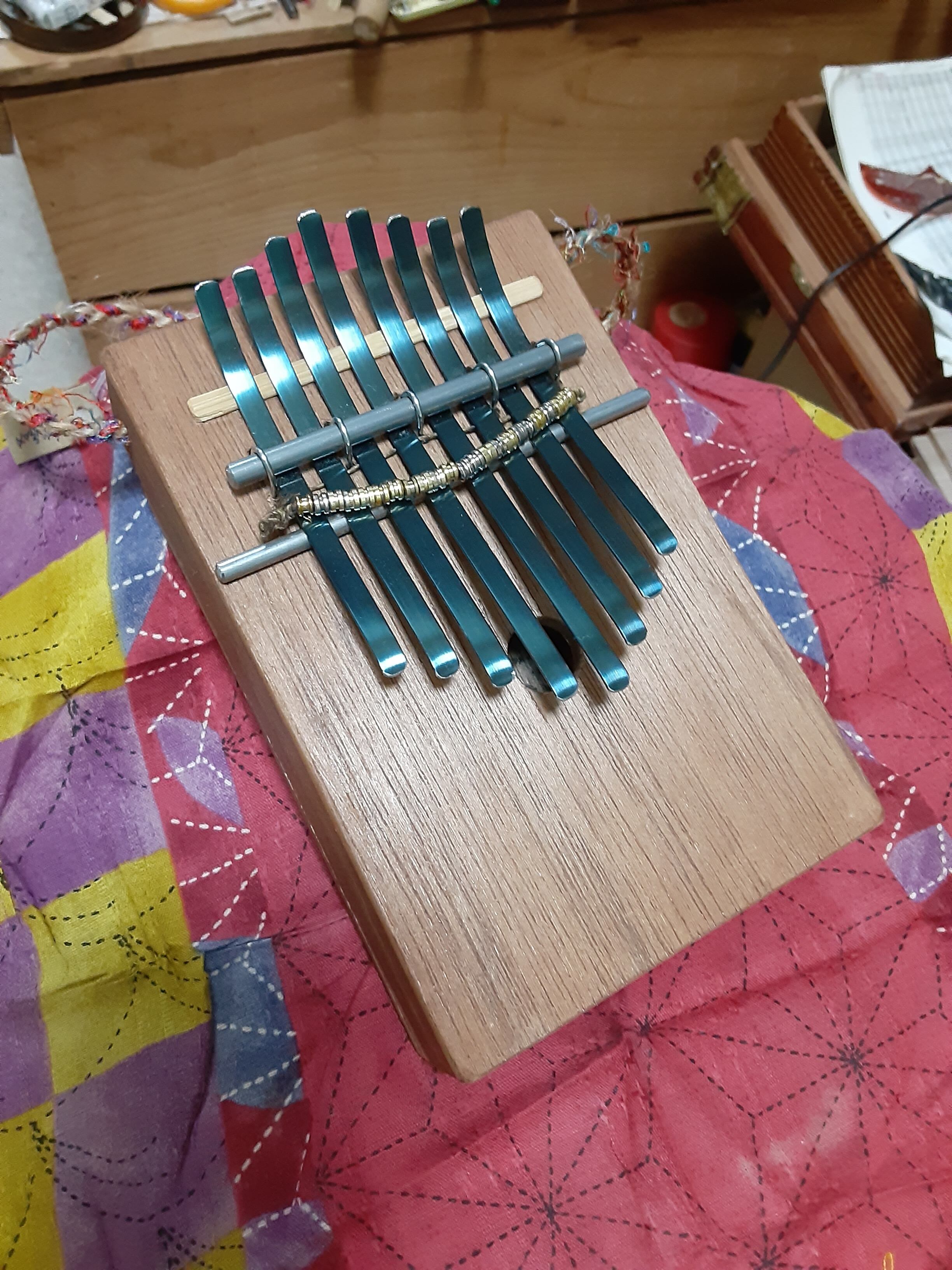 タンザニア/チリンバスタイルの箱型(5.5mmラワン合板製)ボディの8キーカリンバです。ギター弦ボールエンドのバズ装置がキーとともに振動して、より深い響きを作ります。バック左右のホールを指で開閉することでビブラートもかけられます。8本のキーはアバウトにG(あるいはEm)のペンタトニック(G/A/B/D/E/G/A/B)としてありますがキーを動かして、お好みにチューニングすることも可能です。文庫本サイズの手によく馴染む大きさです。爪弾きながら歌ったり、あるいはP.U.を使うなどしてエフェクトしたり、、無限のイメージを広げて下さい。