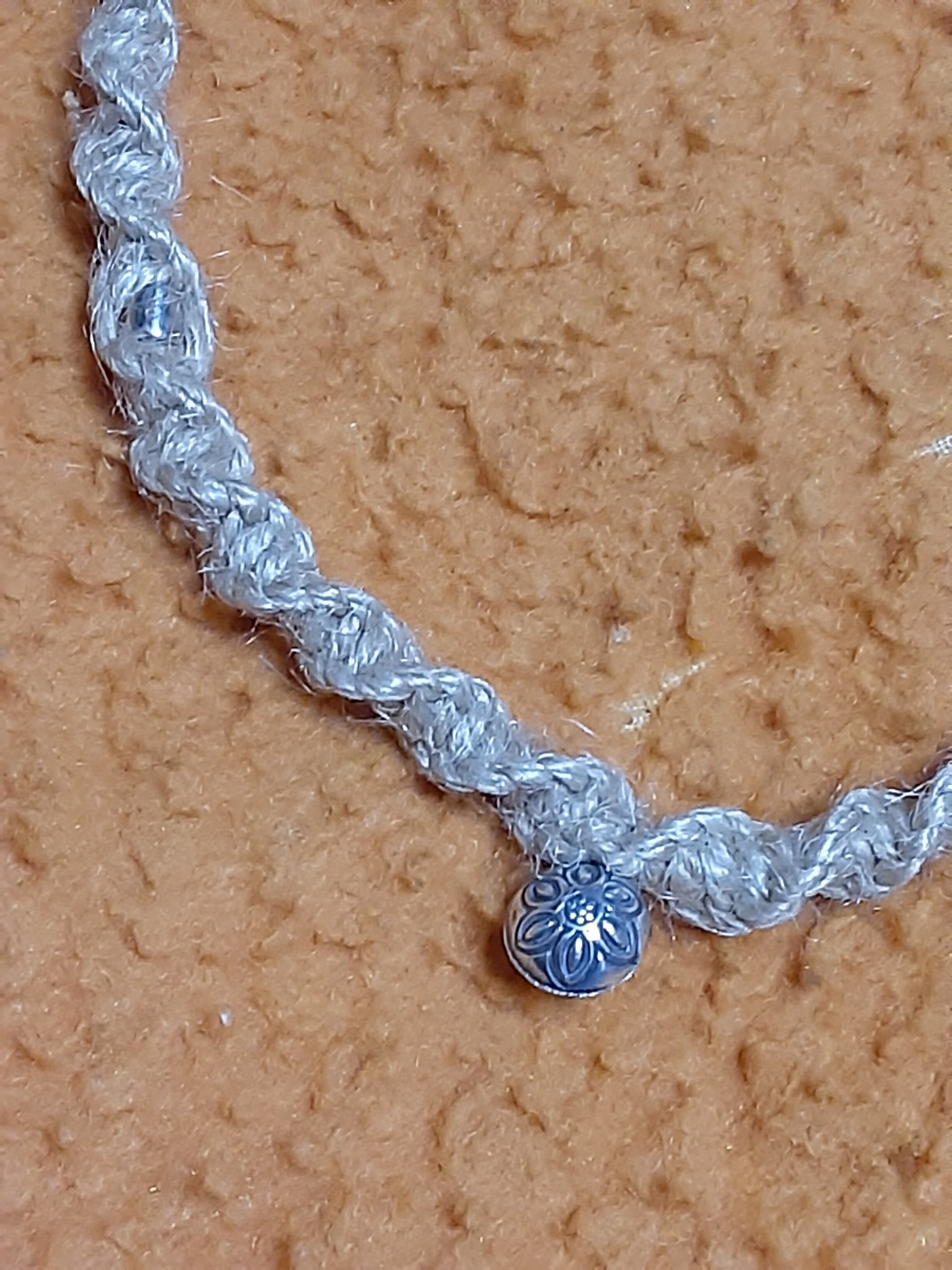 チリチリとかわいらしく鳴るカレンシルバーの小さな鈴をトップにして荒いジュートで編みました。片側にポツンと着いているのは知人の銀粘土作家に作ってもらったビーズです。頭からスッポリ被れるくらいの長さです。長さを調節できるように大きなビーズを着けました。(トップ径約11.5mm)