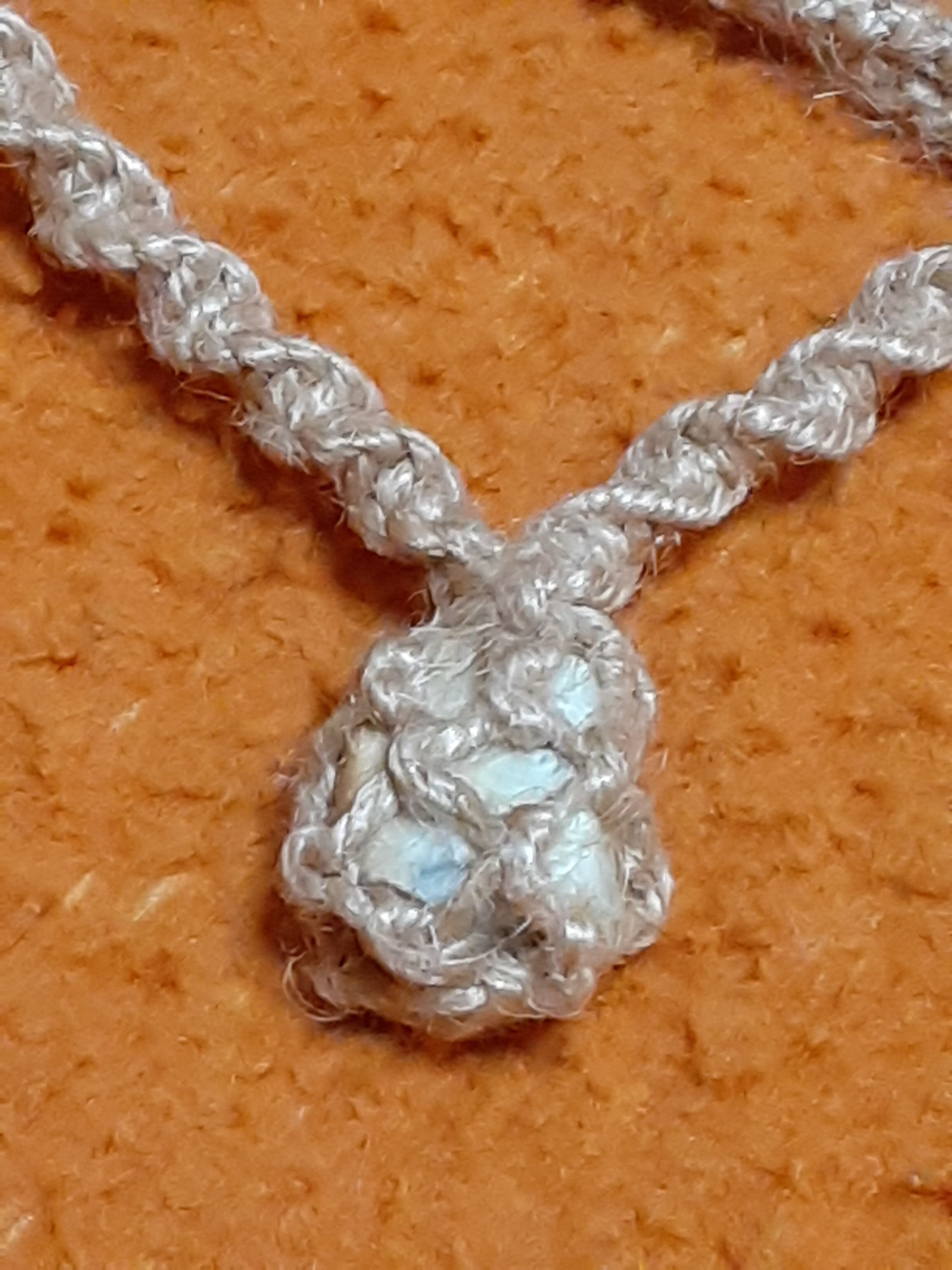 レモンクリソプレースという石だそうです。アレキサンダー大王の守護石だったとか、、荒いジュートで編みました。頭からスッポリ被れるくらいの長さです。長さを調節できるように大きなビーズを着けました。(トップ長約26mm)