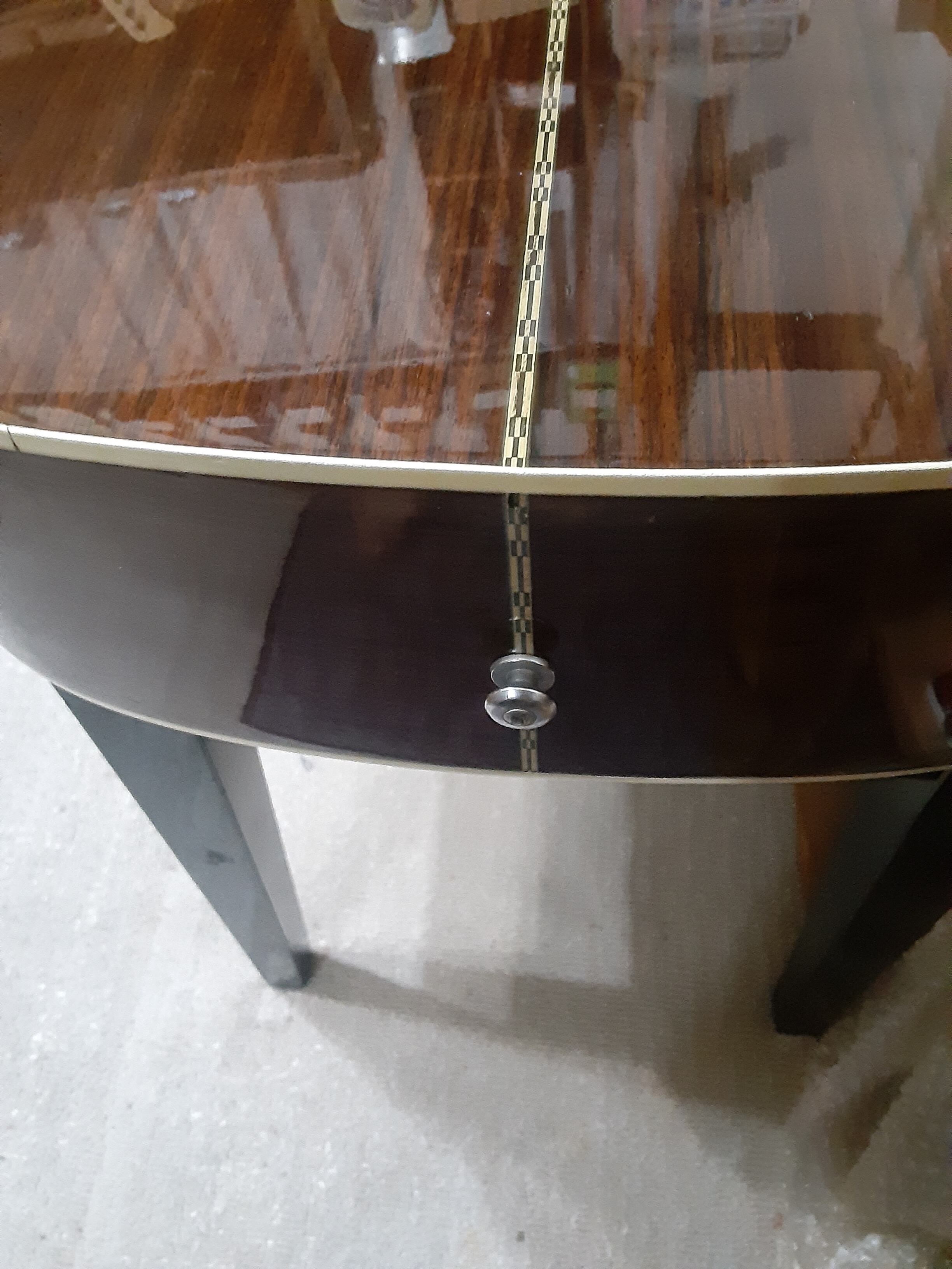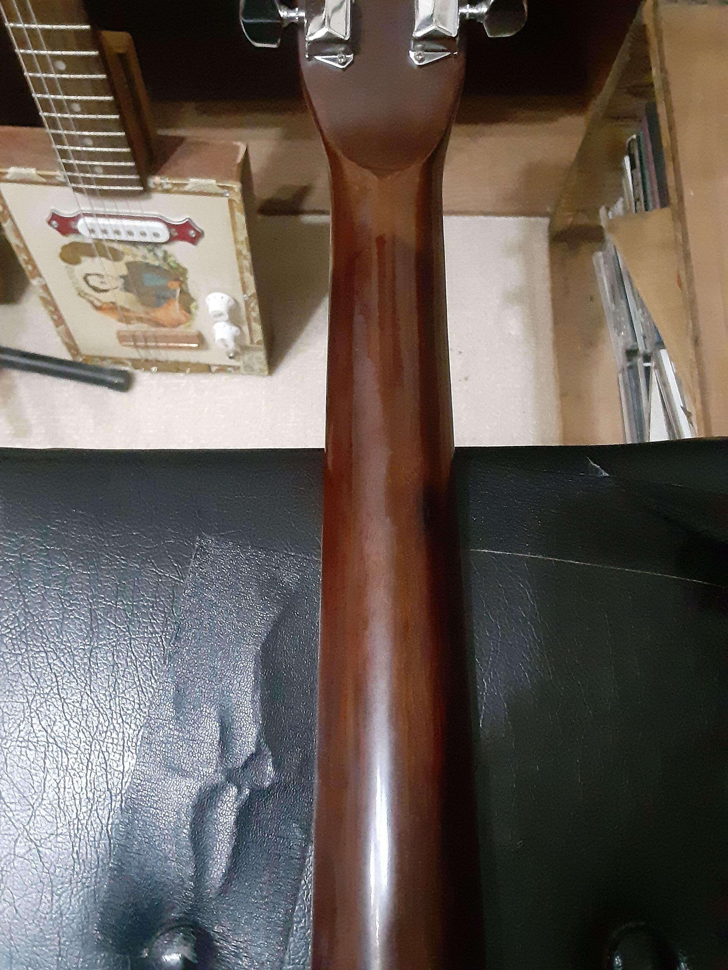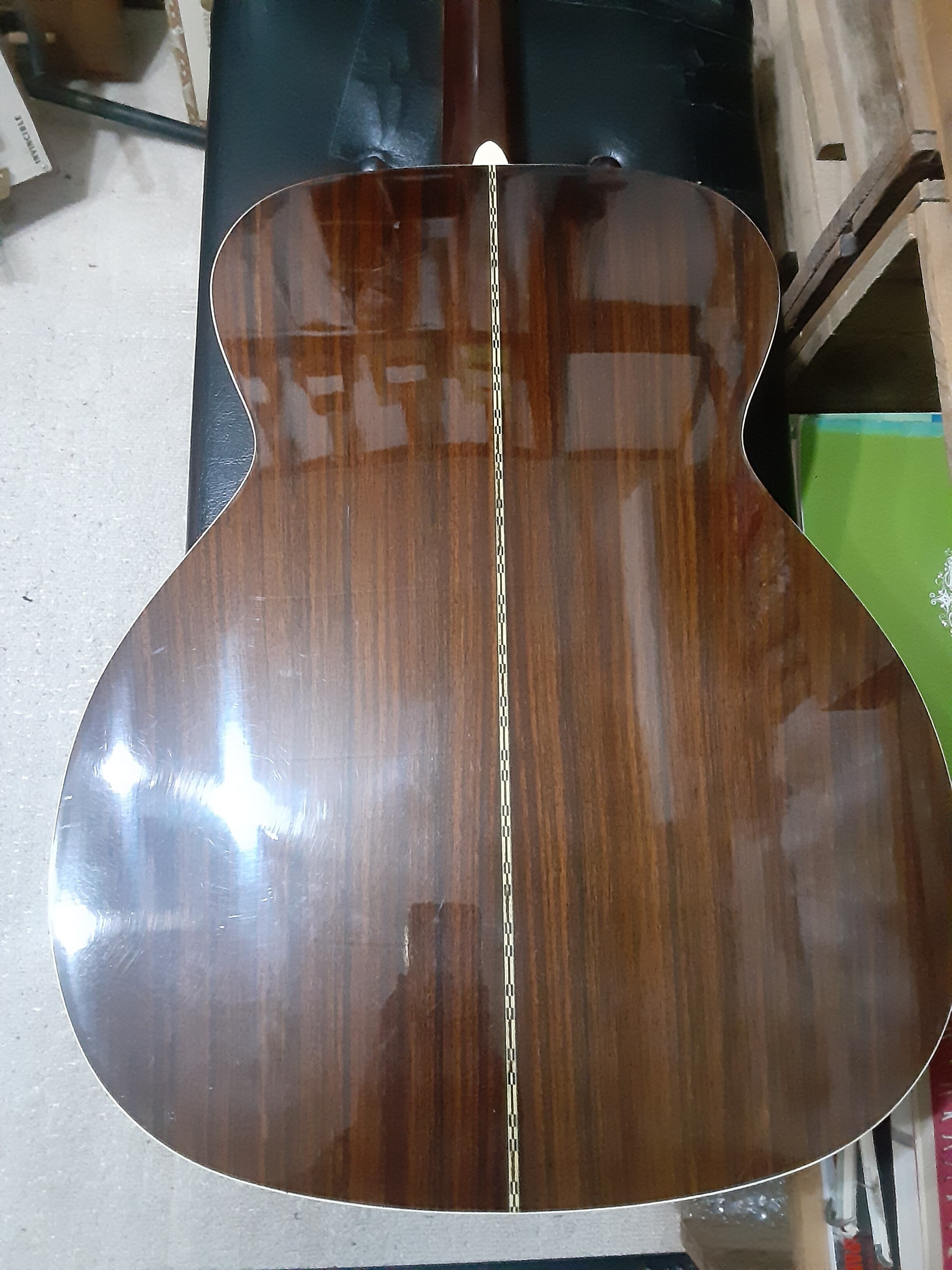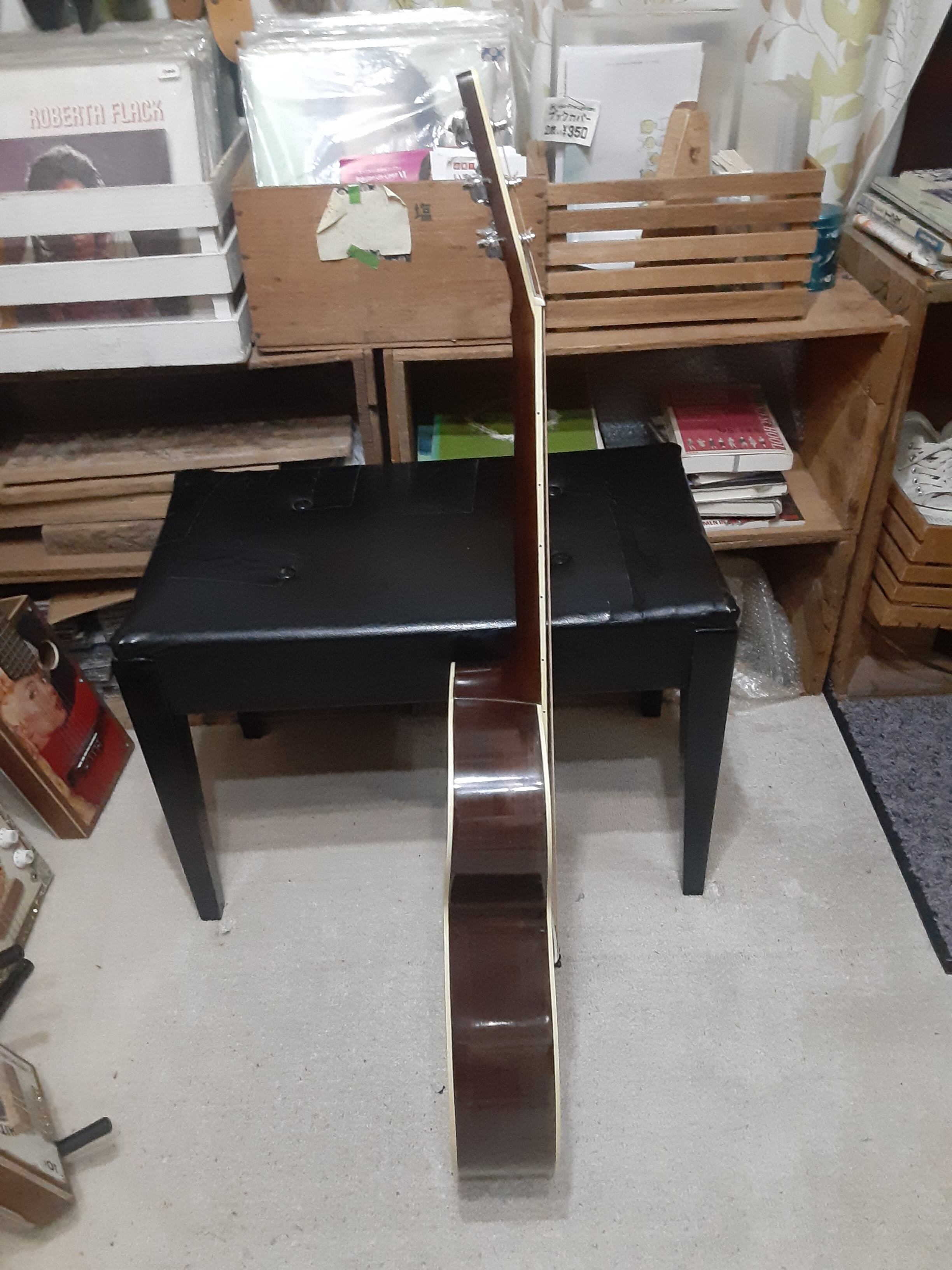 74年?トップ/スプルース、サイド、バック/ローズウッド、ネック/ナトー、フィンガーボード/ローズウッド。だいぶ大事にされていたようで、フィンガーボード、フレットのローポジション部分に弾き込んだ跡、サイドなどにラッカーに軽い白濁、バインディング部分の変色、わずかな傷、打痕など、年式相応の劣化はありますが、ボディのトップ落ち、膨らみなどほとんどなく、ネックの状態も概ねよく、全体にきれいでコンディションも非常によいと思います。あまり大きくいじらなければならないところはなかったですが、唯一サドルだけがサイズ(厚さ)の合っていないものが着いていたので、新たに作成しました。当時の中堅クラスのモデルで、エントリーモデルとは明らかに違うグレードを感じます。明るいふくよかな音色でよく鳴っていると思います。まだまだ、これから長く弾いて行けるモデルだし、弾いてほしいと思うモデルです。